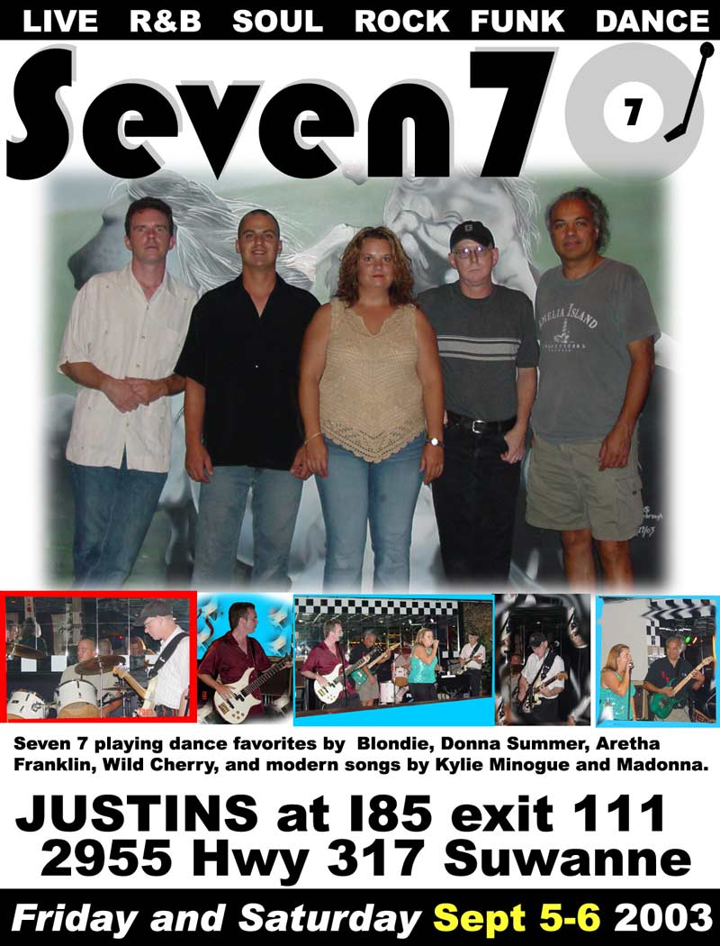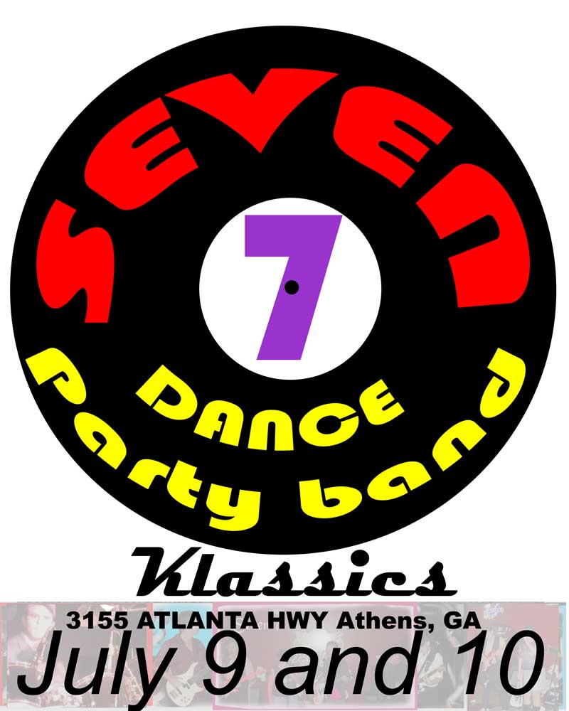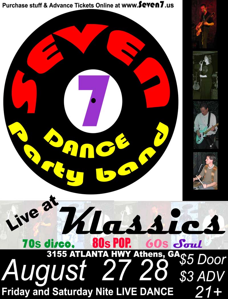 Athens live dance party music is our business.  Wedding parties frat parties or sororities and all types of private and public occasions.  All music, lyrics, and references to the same are the copyrights and or registered trademarks of their respective owners.  Please notify us of any potential unintended infringement thereof.  Send mail to booking@seven7.us with questions or comments about this web site.  This site designed, hosted, marketed, and supported by John KirschMusic recorded, stored, and  streamed by John Kirsch.   All content including but not limited to HTML, ASP, JavaScript, VBScript, music video, and  graphics Copyright © 2002, 2003, 2004, 2005, 2006, 2007,  2008, 2009, 2010, and 2011 John Kirsch web design.   This site is optimized 4 Microsoft's media player.  We appreciate Google's high ranking.  Enjoy Atlanta and Athens best dance music, funk music, and disco wedding music 80s band.  No booking agent, booking agency and/or booking angencies' fees are required or paid when you book Atlanta's seven 7 wedding band online.  Call 706-351-0224 (local Athens, GA call) for the best live music entertainment in Georgia. Seven 7 is Georgia's Cover Band